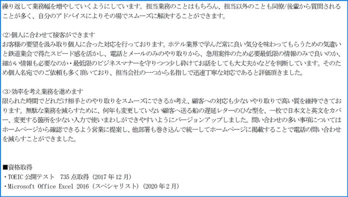 今回はそれを防ぐために、後半の自己PRのところをかなり充実させることでカバーしています。