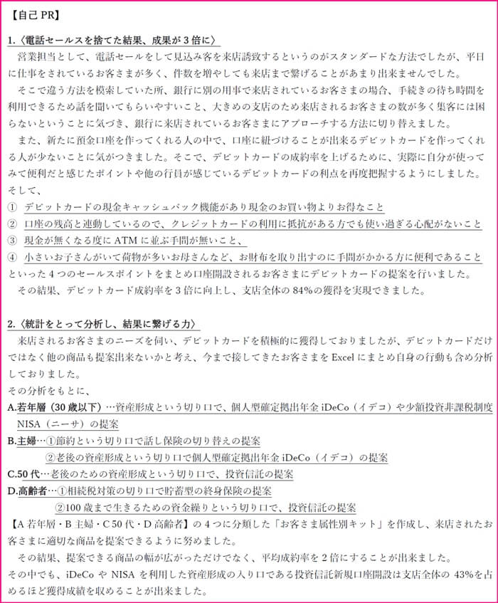 「先輩のセールスに同席し、営業手法を学ぶ」なんてことをわざわざ書く必要ありませんし、そこを太字で強調されても「…?」ってしかなりません。